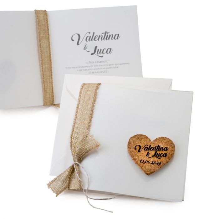 Original participación para boda con aires orgánicos y de materiales naturales. Perfecto motivo para anunciar a todos en esta original participación vuestros deseos de que asistan al enlace. Esta participación con forma de libro, está realizada en su part