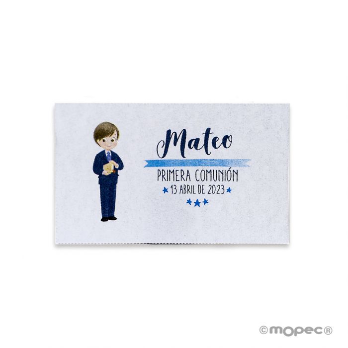 Personalice los recuerdos de la Primera Comunión de su hijo con estas tarjetas precortadas diseñadas por mopec®. Es un motivo bonito y simpático en el que se ve a un niño vestido con traje, corbata y una Biblia en las manos el día de su Comumión. Puede su