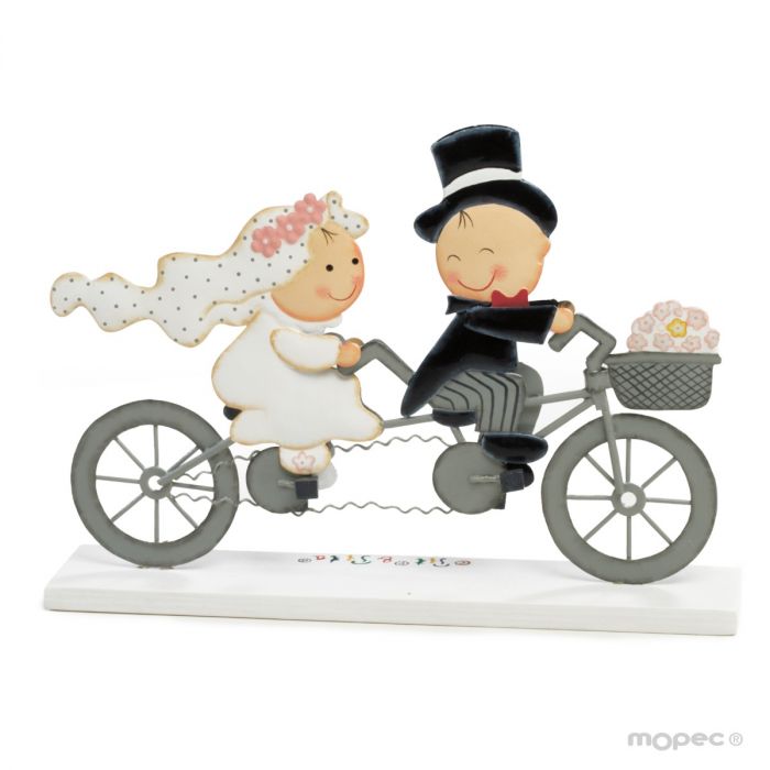 Cake topper Pit&Pita® on a tandem pedaling as a couple leaving the wedding. A tender and sweet representation of newlyweds.