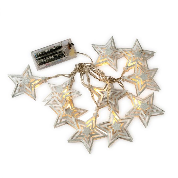 Preciosa guirnalda de estrellas metálicas con iluminación led en su interior. La guirnalda de 1,60 metros de largo se compone de 10 estrellas blancas con volumen. Perfecta para decorar estancias o el árbol de Navidad y darles un estilo festivo.
