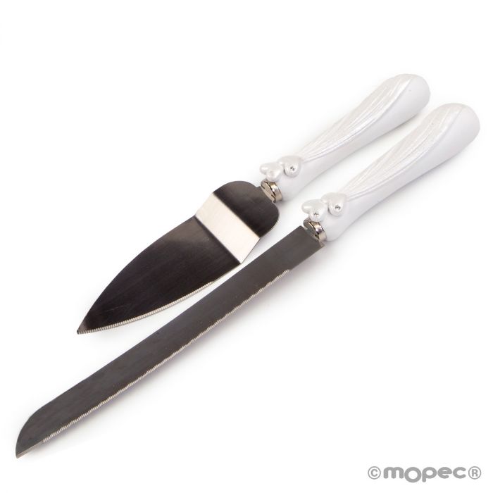Exquisito juego de cuchillo y pala para tarta con detalles en forma de corazones. Es perfecto para darle un toque de distinción y originalidad al momento de cortar la tarta.