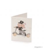 Tarjeta librito de los novios Pit&Pita, novios sentados en un banco con forma de corazón