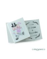 Es un detalle divertido y romántico donde aparecen los recién casados sentados en un banco con forma de corazón. Es un complemento original y bonito ideal para cualquier boda o enlace.