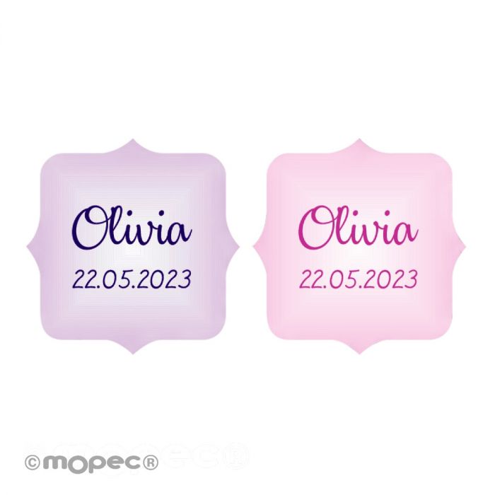 Bonitas etiquetas adhesivas de 3,7x3,7cm. en colores lila y rosa que podrá pegar en los detalles de boda, cumpleaños, Comunión... que vaya a regalar a los invitados personalizando aún más el detalle. El degradado de cada una de las tonalidades resalta aún más el texto que escriba en ellas. Se venden en packs de 5 hojas. Cada una de las hojas contiene 54 etiquetas rosas y 24 etiquetas lilas. Personalizable.