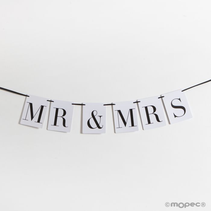 Divertida guirnalda decorativa pensada como apoyo decorativo para bodas. La posición de cada tarjeta es ajustrable en la cinta negra de raso. Queda genial como complemento.