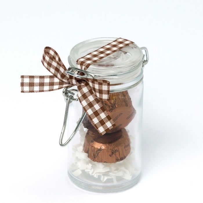 Graziosi barattoli di vetro con coperchio con chiusura a leva, decorati con 3 deliziosi cioccolatini al latte avvolti in un'attraente carta marrone.