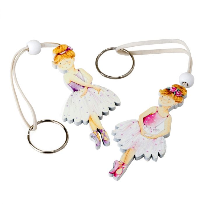 Estos bonitos llaveros de 13cm. de diámetro son el regalo perfecto para sorprender a todos.Ideal para regalar en una fiesta infantil o como detalle de Comunión. Se venden surtidos en 2 diseños diferentes. Para los niños más mayorcitos puede ser el inicio de la responsabilidad de llevar sus propias llaves. Para los más pequeños una genial decoración para la mochila del cole. La figura de madera en 2D de bonitas bailarinas mide aprox: 7,5x4cm.