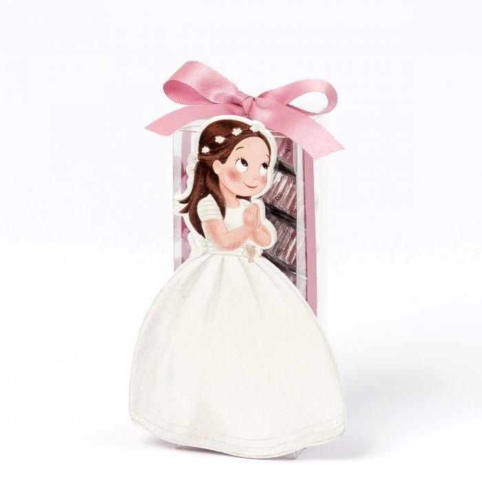 Bellissimo astuccio da 12 cioccolatini con incarto color malva e argento, decorato con un fiocco color malva e una bambina da comunione con abito lungo e corona floreale.